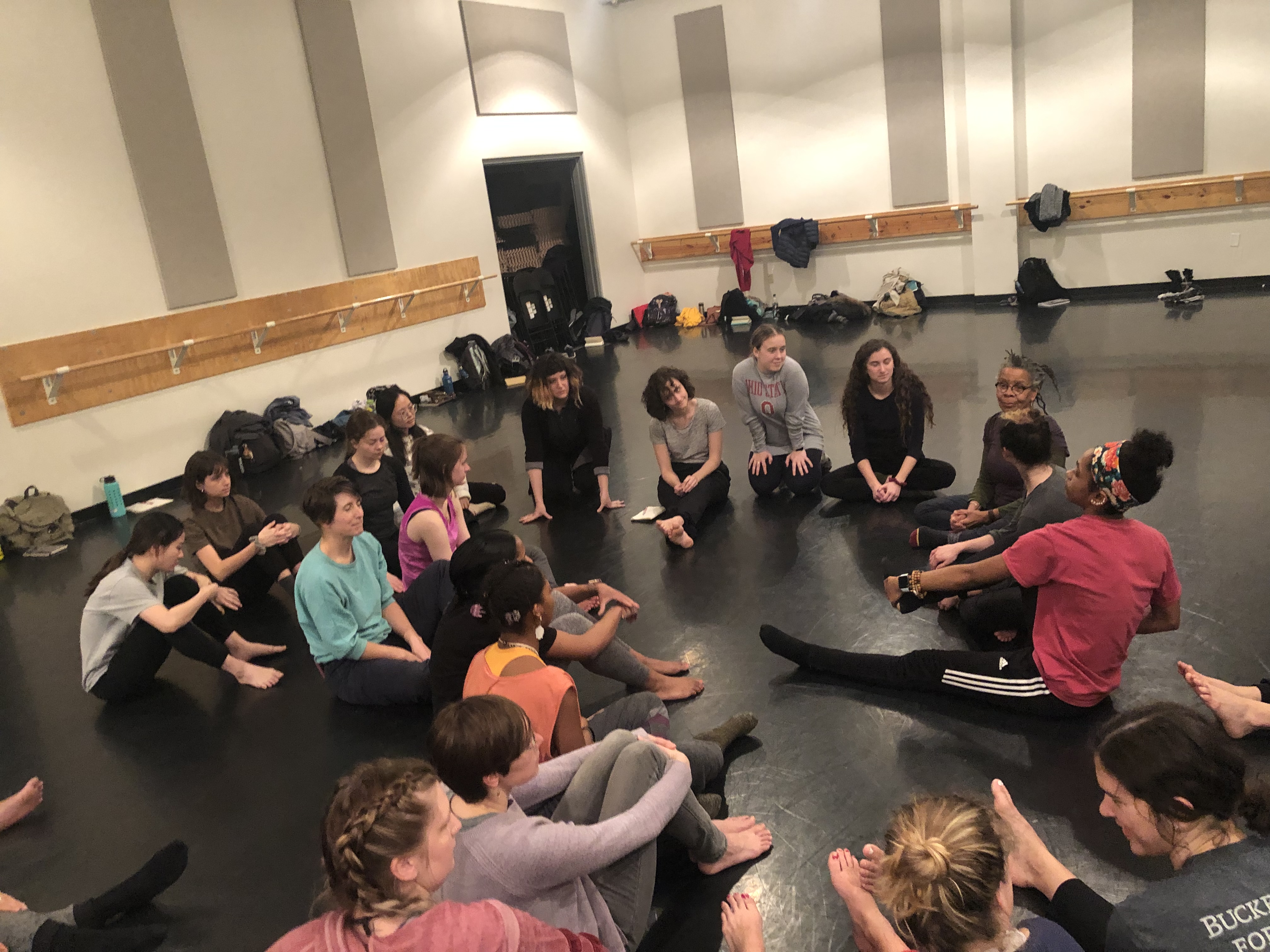 We had the opportunity to take a master class with Bebe Miller. In this class we danced and dramaturg around the idea of relationship. We started with looking at different angles of movement and where the initiation and flow of energy was traveling throigh the body on her dancers. Then we had activities that prompt us to move between 11 and 2 and 1. Many of us wore ourselves, for our (including myself) minds thought that 11 was the end goal, and 1 was the beginning. But again, what is our relationship to the # and where does this sit in the movement.